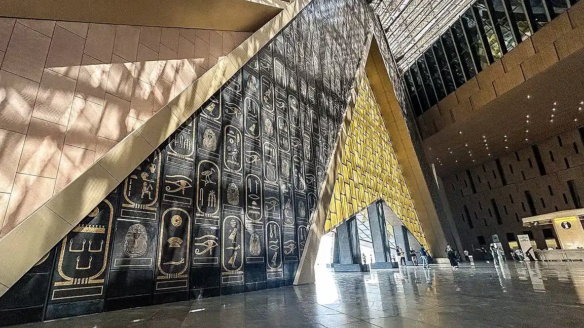 Entdecken Sie die weltweit größte Sammlung antiker ägyptischer Artefakte im neuen Grand Egyptian Museum. Sehen Sie Höhepunkte wie den hängenden Obelisken, die kolossale Ramses-II.-Statue, die große Treppe und die berühmten Schätze Tutanchamuns. Verpassen Sie nicht den atemberaubenden Panoramablick auf die Pyramiden vom Ende der Großen Treppe.