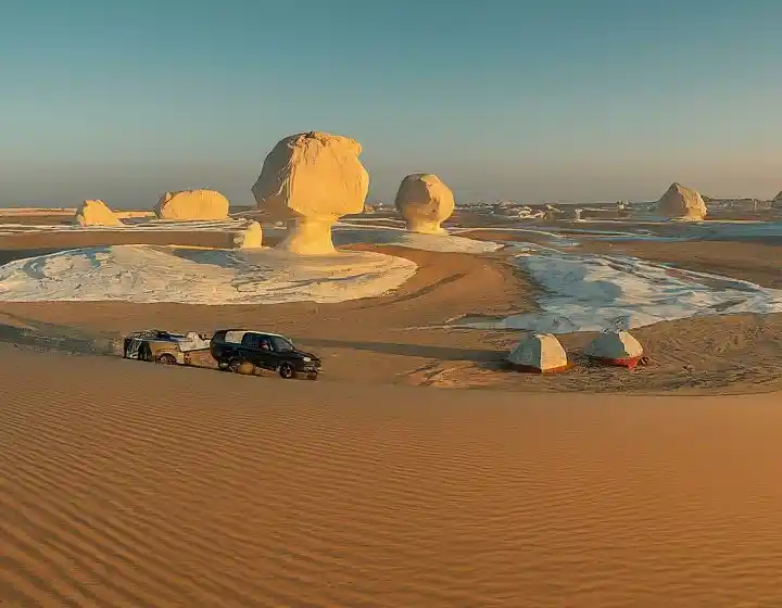 Once you reach the oasis, transfer into a 4X4 jeep and begin exploring the Western Desert. - Visit the Black Desert and the natural hot spring of Al Haize Valley