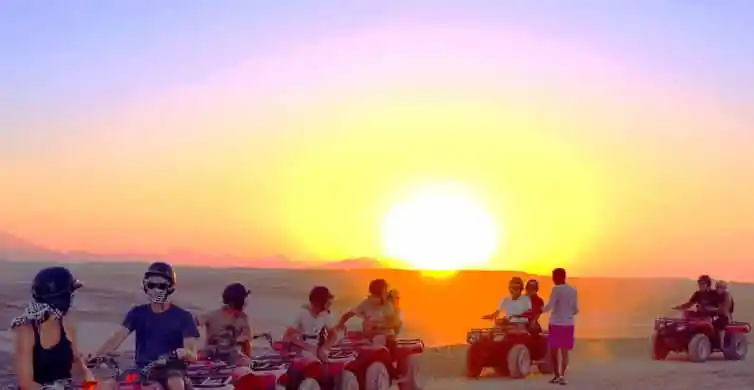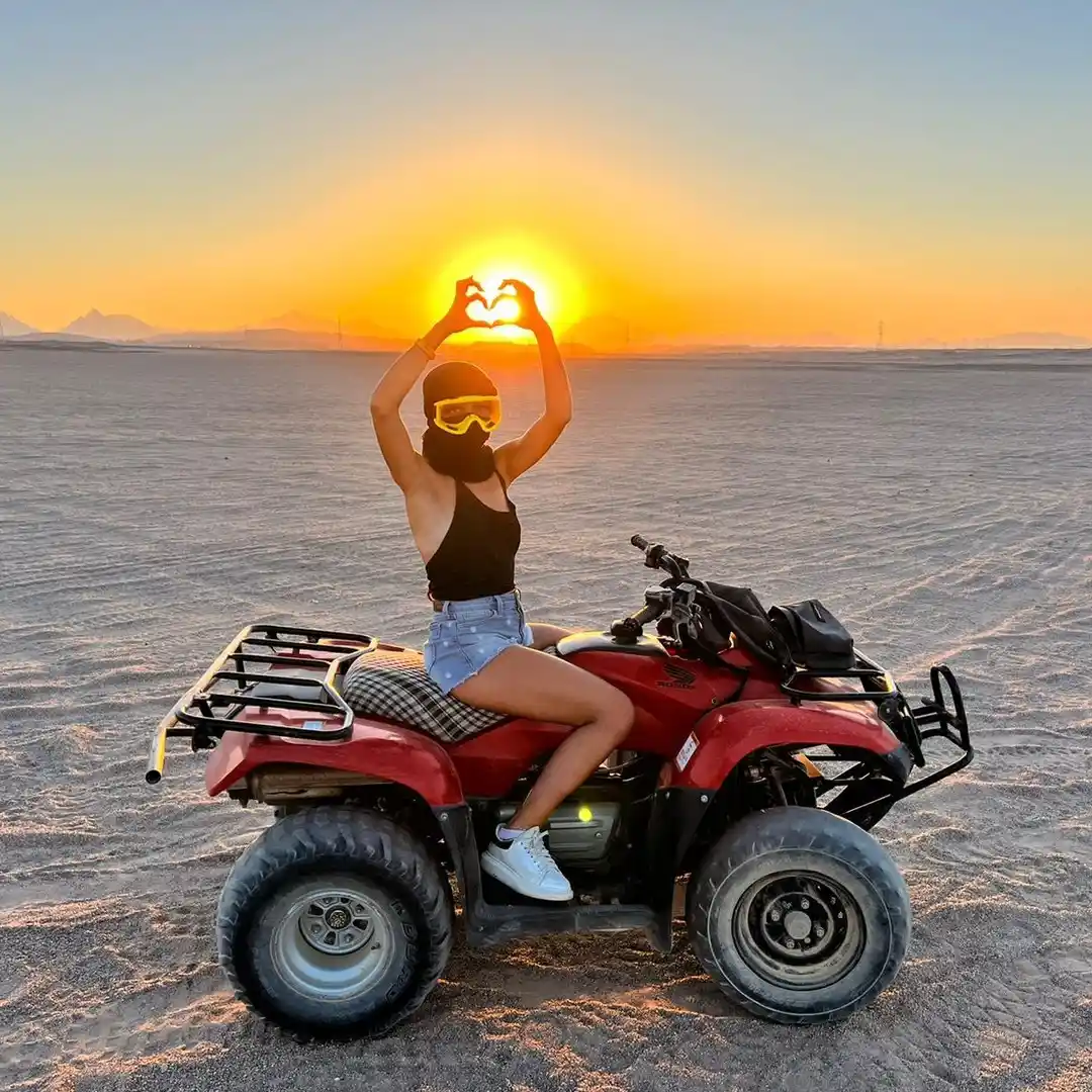Experience thrilling desert adventures in Sharm El Sheikh on an exciting quad bike safari. Ride through golden sand dunes at sunset, capturing stunning photos along the way. Visit a Bedouin camp, savor traditional black tea, and enjoy a delicious BBQ dinner under starry skies. Witness authentic Bedouin life, take a camel ride, and watch captivating dancing and singing performances. This unforgettable desert safari promises excitement, culture, and a magical evening you’ll always remember.